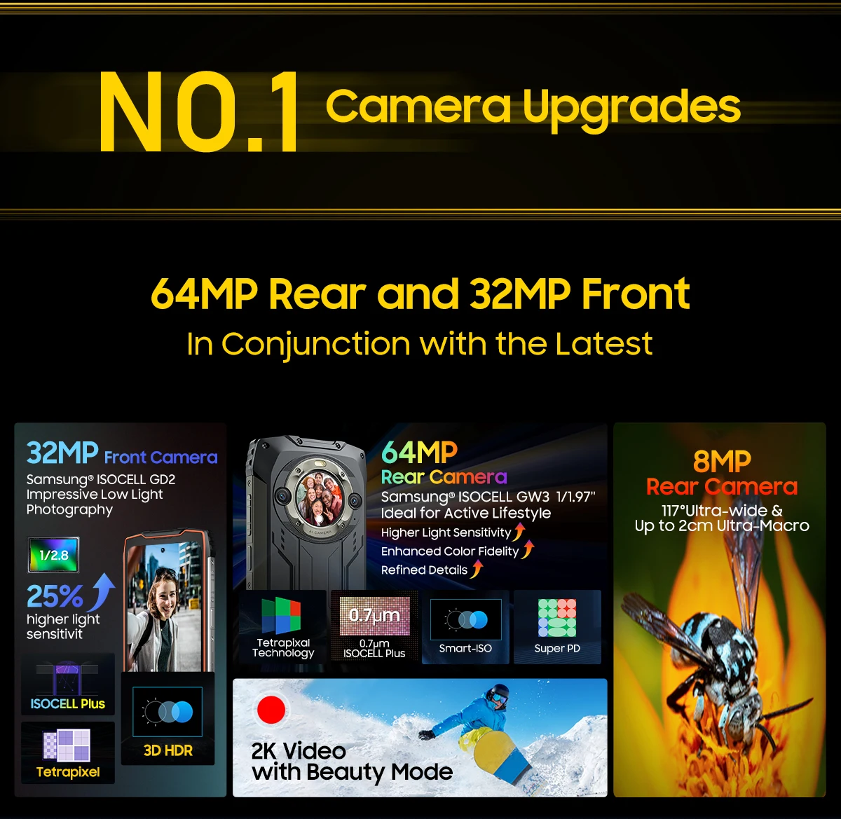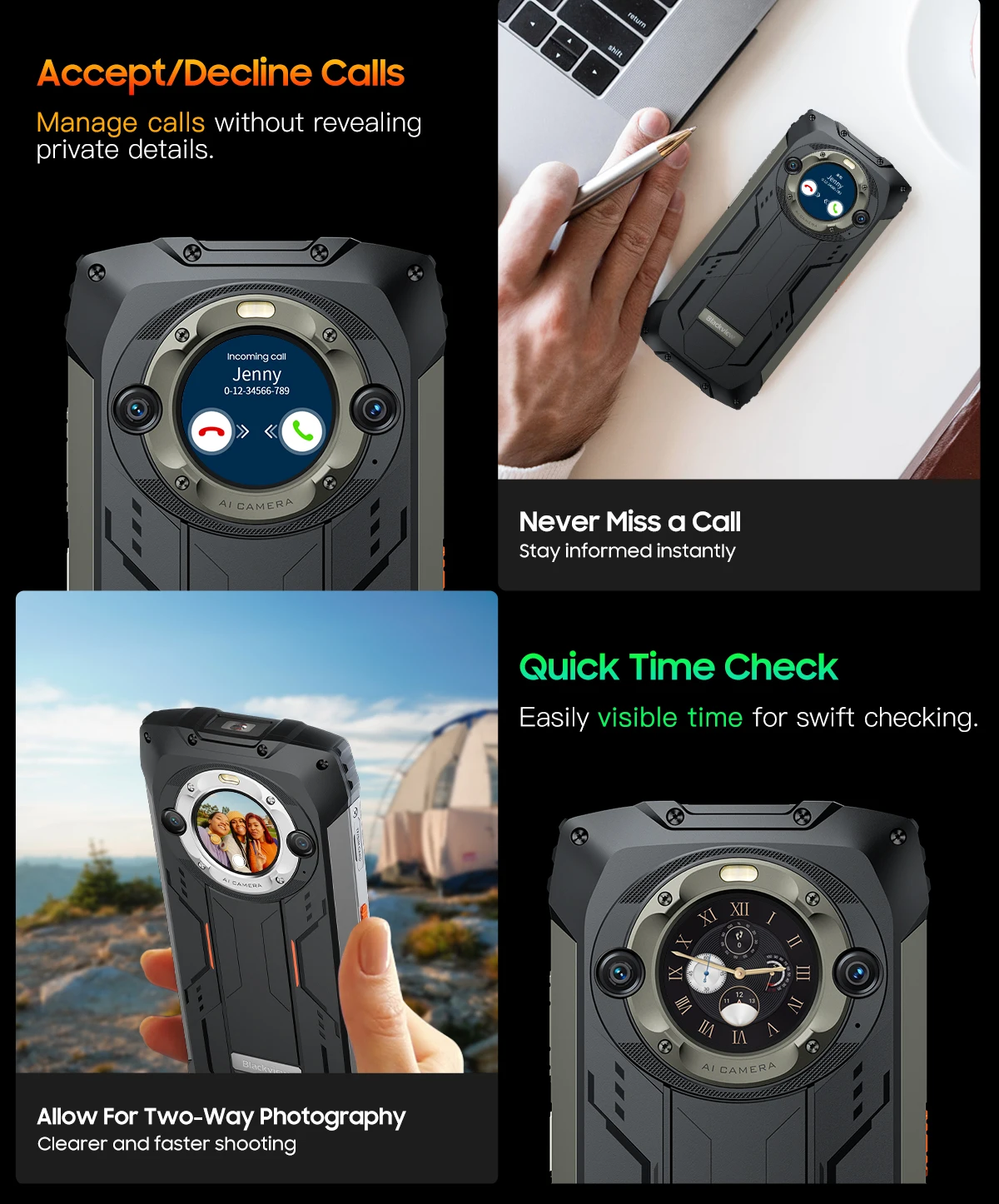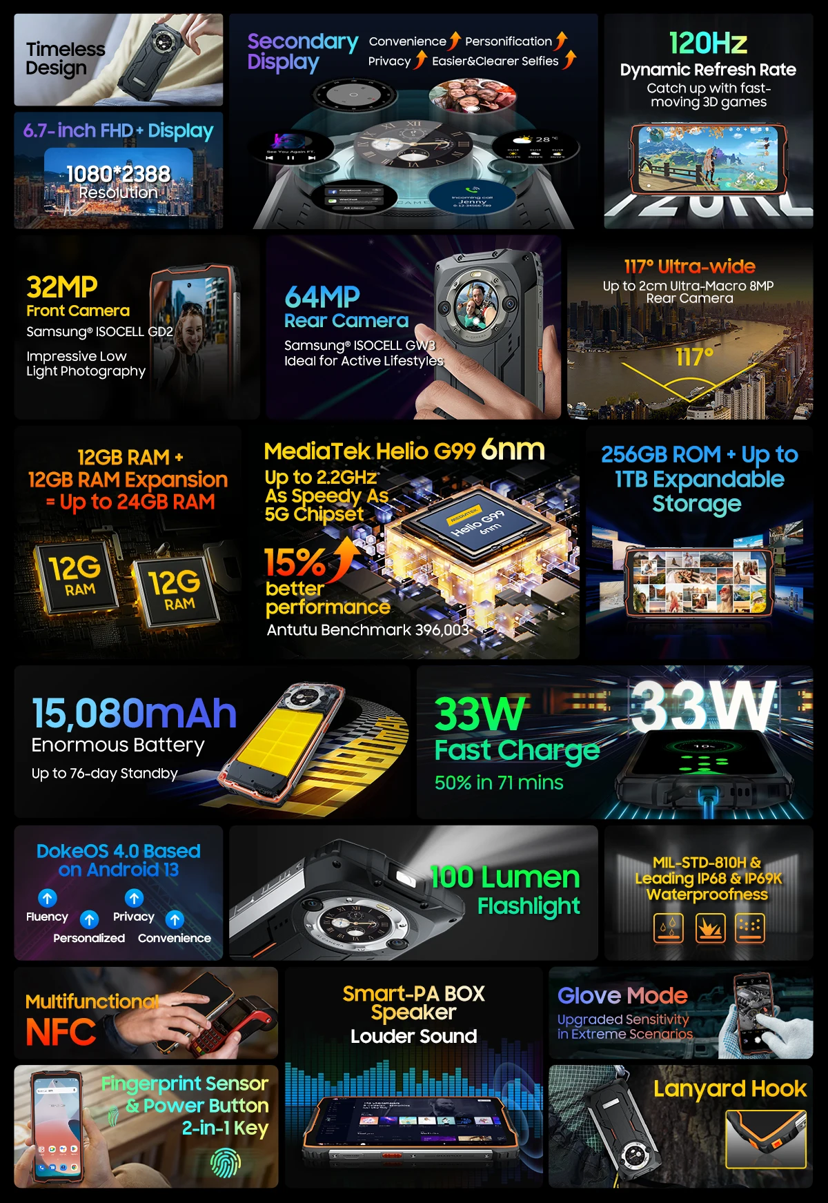 CPU: MTK Helio G99 6nm, Octa core, Cortex-A76 @ 2.2GHz*2, Cortex-A55 @ 2.0GHz*6 OS: Android 13 Screen: 6.7" FHD+ IPS 1080*2388 120Hz Refresh Display Back Dual Screen: 1.32 inch, 360*360 RAM: 12GB+ 12GB RAM Expansion,8GB+ 12GB RAM Expansion ROM: 256GB+1TB Expansion Rear Camera: 64MP+8MP+2MP Front Camera: 32MP Battery: 15080mAh with 33W fast charging SIM: Dual SIM Card or 1* SIM…